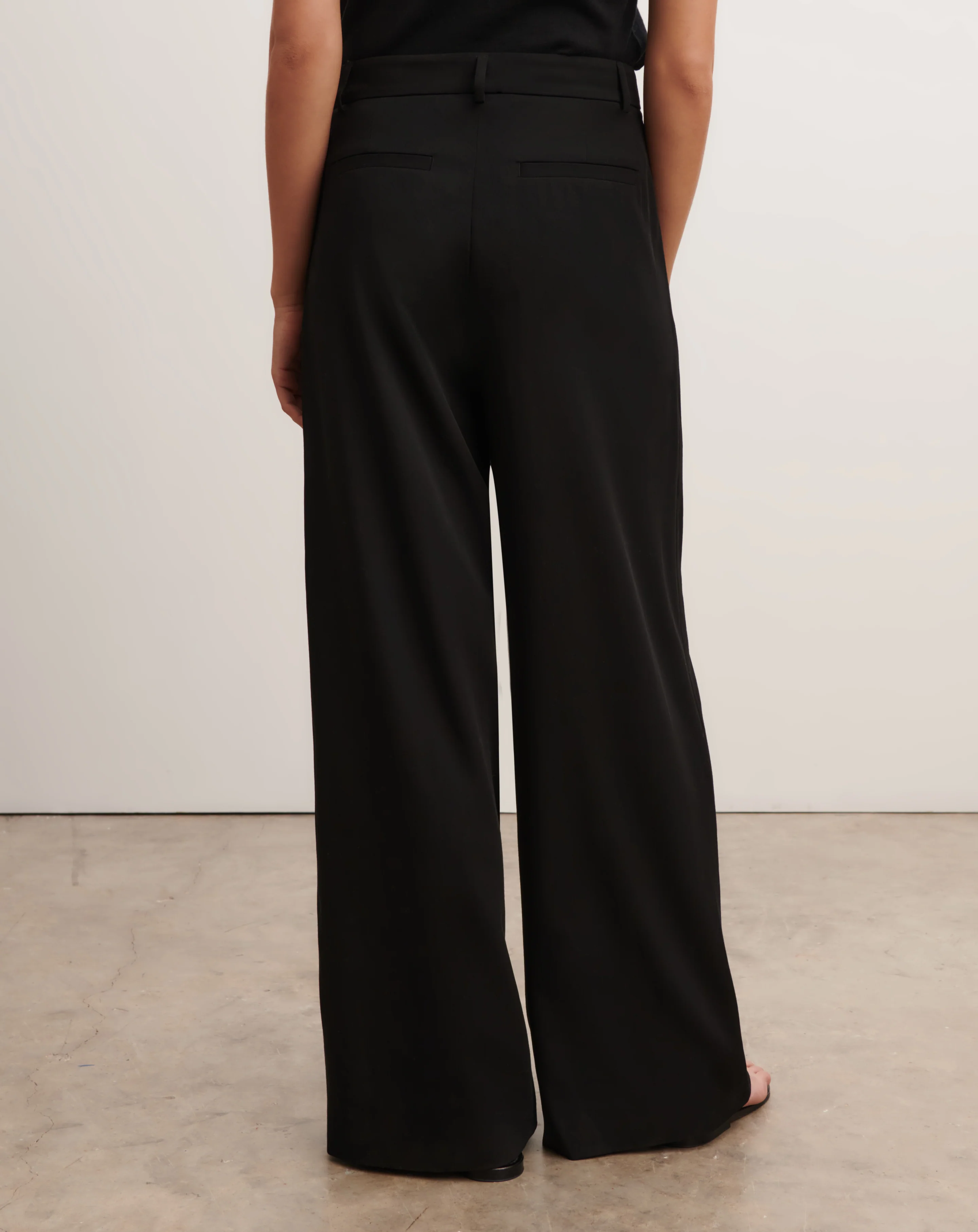 Pantalon à plis femme en drap de laine froide ultrafin. Modèle taille haute, à coupe ample et longue.